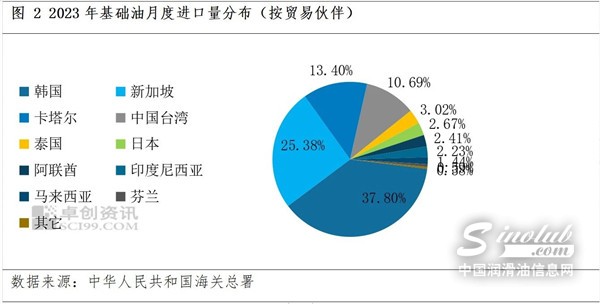 2023年進口量排名前三的分(fèn)別是韓國、新加坡、卡塔(tǎ)爾。其中自韓國進口基礎油為(wéi)66.27萬噸,同比下(xià)降(jiàng)0.18%,占進口(kǒu)總(zǒng)量的37.79%,位(wèi)列第一位;自新加坡進口基礎油為44.50萬噸,同比上漲3.18%,占進口總量的25.38%,位列(liè)第二位;自卡塔(tǎ)爾進口基礎油為23.50萬噸,同比上漲16.90%,占(zhàn)進口總量的13.40%,排名第三位。
