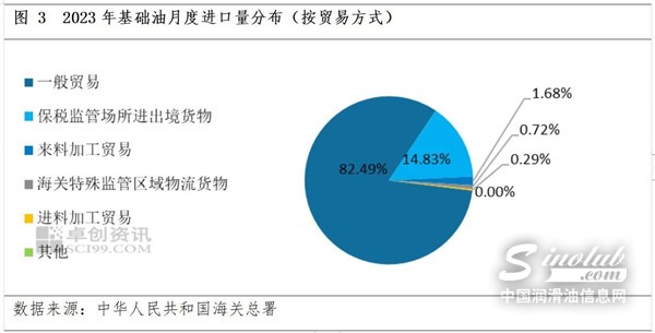 從貿易方式來(lái)看,近五年基(jī)礎油進口貿易方式基本穩定。據海關總署數據顯示,2023年基礎油進口貿易方式(shì)主要為一般貿易、保稅監管場所進(jìn)出境貨(huò)物及來料加工貿易。其中,一般貿易模式進口基礎油占全部進口的82.49%,排名第一位;保稅監管場(chǎng)所進出境貨物占進口總量的14.83%,排名第二位;來料加工貿易(yì)占比1.67%,排名第三位(wèi)。