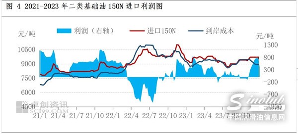 從進口利潤來看,2023年二類基礎油進口利潤較去年相比有所回升,利潤空間較為可觀。一季度受(shòu)國產資源價格(gé)上漲帶動,二類進口基礎油價格不斷(duàn)攀升(shēng),且價格(gé)上行幅度遠高於到(dào)岸成本上行,因此一季度二類進(jìn)口基礎油理論利潤較為可觀,進口(kǒu)商進口積極性相對較(jiào)高。二季度,雖然外盤價格有所下降,但(dàn)受低價國產(chǎn)資(zī)源衝擊,進口基礎油國內售價亦處於下行趨勢,進口基礎油利潤空間縮減,6月(yuè)份進口基礎油理論利潤出現虧損,二季度基礎油進口積極性有所下降。三季度7-8月份外(wài)盤價(jià)格有所下降(jiàng),進口基礎油理論利潤(rùn)有所回(huí)升,但從8月中旬(xún)-10月份受外盤價格上漲及人民幣匯(huì)率(lǜ)等因素影響,二類進口基礎油到岸成(chéng)本不斷攀升,進口基礎油理論利潤出現縮減,10月(yuè)份(fèn)進口基礎油(yóu)理論(lùn)利潤再度出現虧損情況。11-12月份,一是外盤價格(gé)有所下降,二類進口基礎油到岸成本下降;二是國內二類進口基礎油現貨資源偏緊,市場價格高位運行,因(yīn)此11-12月份二類進口(kǒu)基礎油理論利潤有(yǒu)所上升。據卓創資訊數據統計,2023年進口基礎油150N理論(lùn)利(lì)潤均值為(wéi)259.23元/噸,較去年同期相比上漲465.58%。